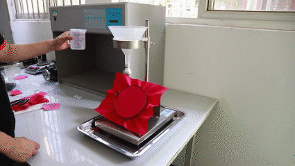 小扬书包采用的是防泼水面料,我们将小扬书包面料放在防水测试仪冲淋一分钟,看布面是否有渗水或吸水现象。