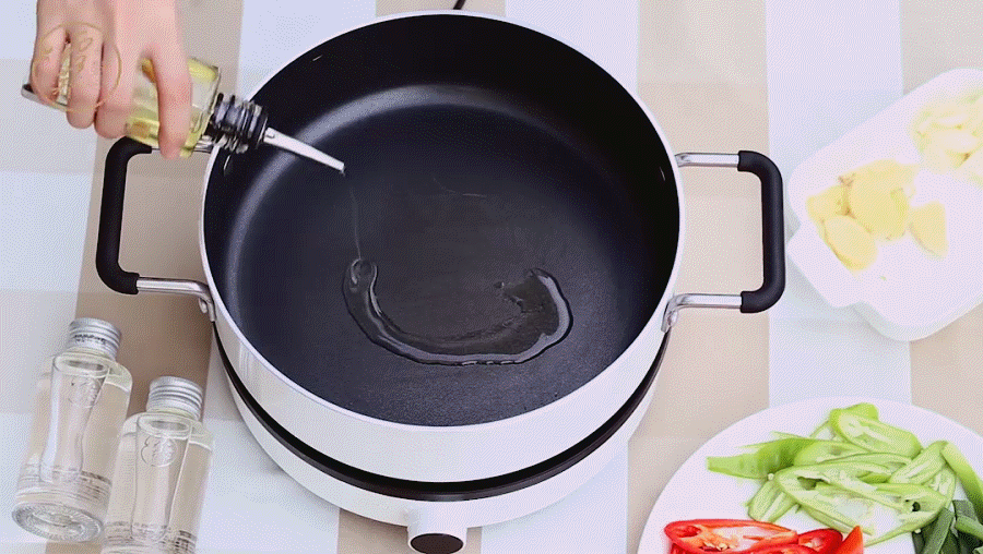 将花椒、姜、蒜和豆瓣酱倒入锅内混合炒出红油