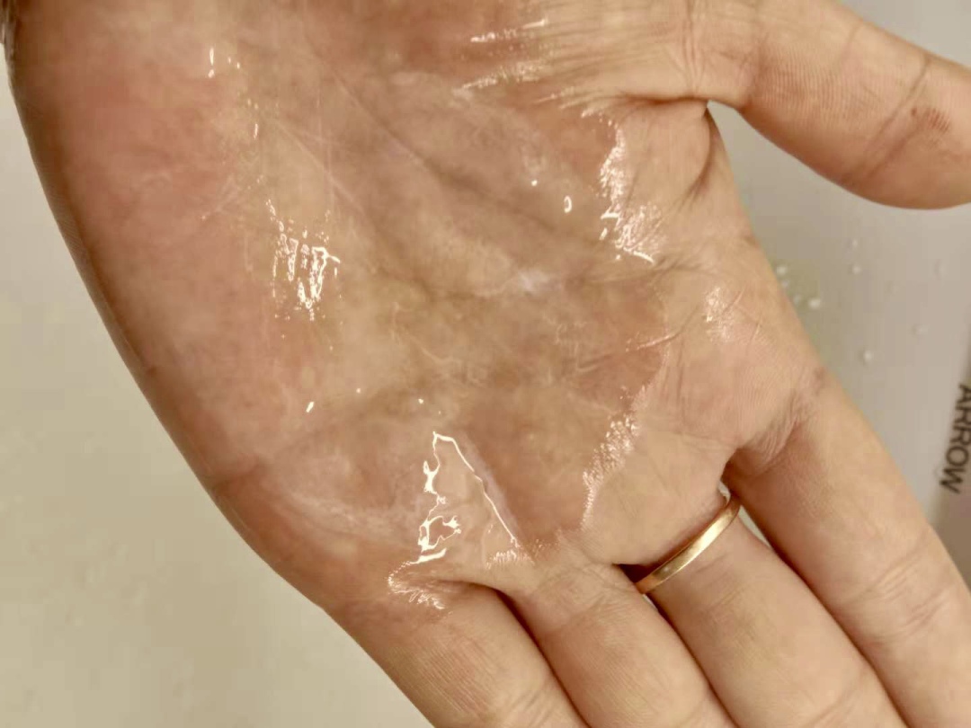 首先乳化很好,拍照时压得有点多,但是还是可以明显看出来加点水就乳化了,上脸也比较温和。