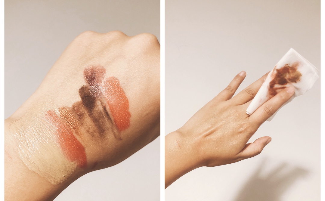 首先说一下包装,非常工整大方,淡淡的黄色很显高级。我把粉底、眼线、眼影、腮红、口红涂抹在手上,然后把水肌美卸妆油挤压在棉柔巾上,轻轻一抹,手上即刻干净了,这让我很是惊喜,因为我原以为会出现颜色混合的晕染,没想到一抹就干净了。