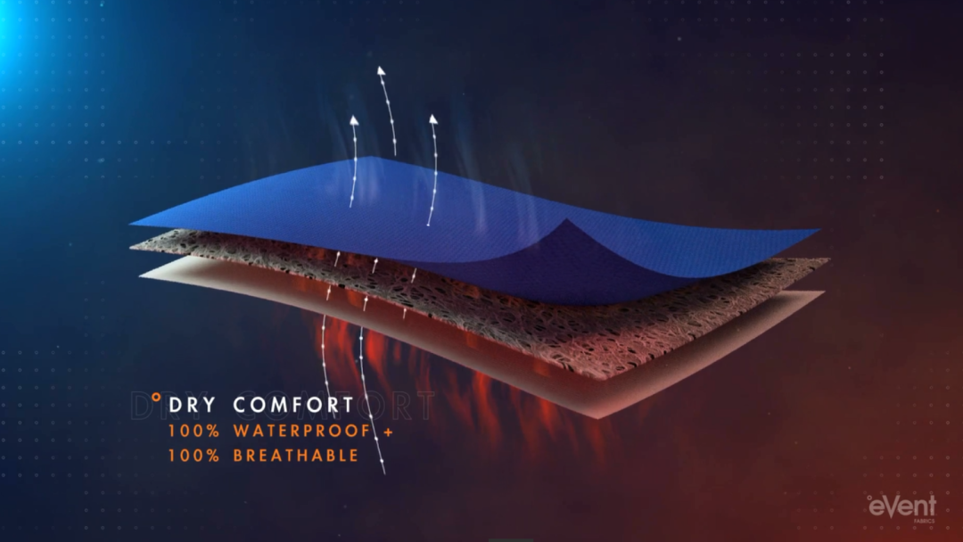 来了解一下我们的材质。 eVent 的品牌于 1999 年创立,是美国( GE )通用下属公司的产品,是目前世界上最优异的防水材料之一,它与另一高端户外品牌始祖鸟采用的 Gore-tex 材质齐名, eVent 超强的透气性与防水性是业界公认的。