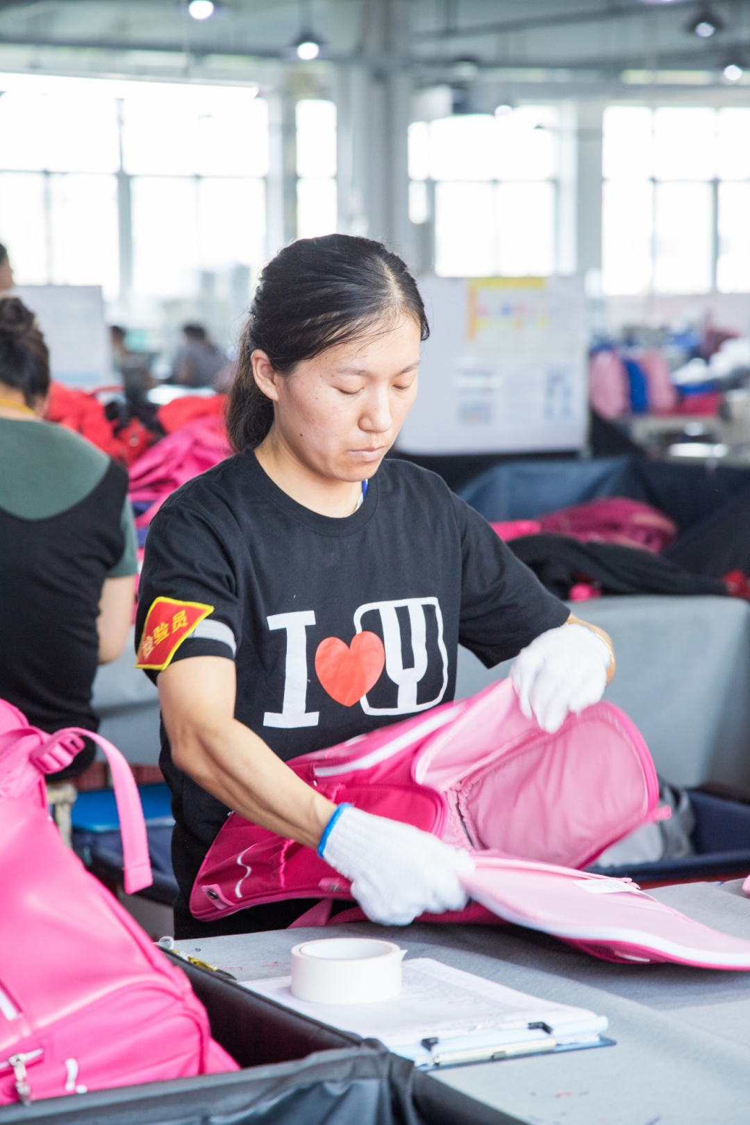 所有的缝纫工序结束后,成型的小扬书包将被送到质检部门, 20 多位负责质检的师傅拿着放大镜、直尺仔细地检查着书包边角的针线是否走齐,角落的折角缝制是否结实,线头的长度是否超过了 5mm …….