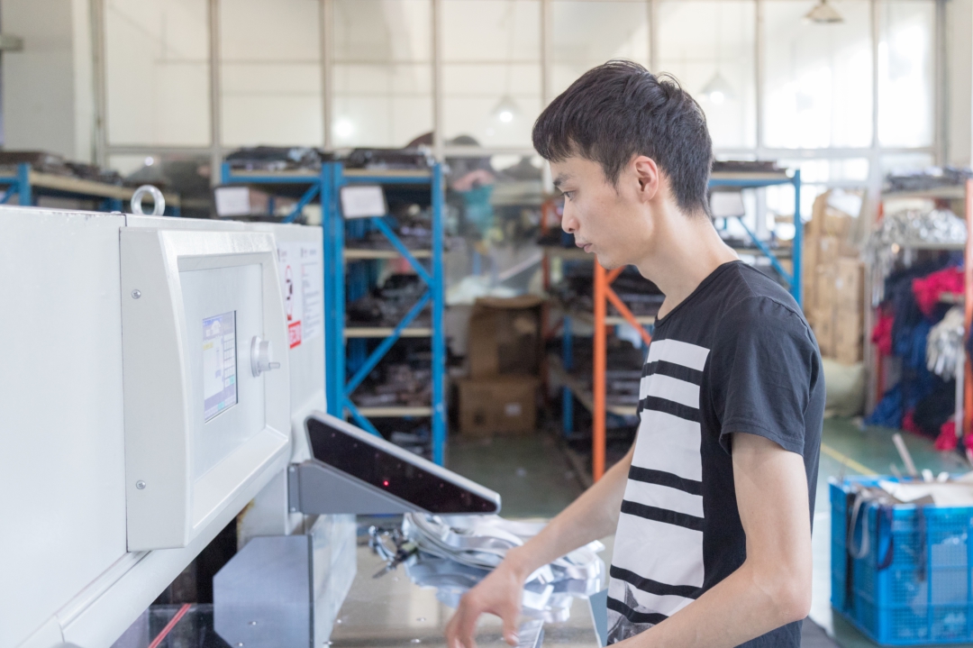 经过实验室各项严格检测的面料方能被送至开料室,在这里一匹匹的面料根据书包的切片要求被切割为不同的尺寸和形状。一个看似简单的小扬书包前后共计需要 71 次开料。