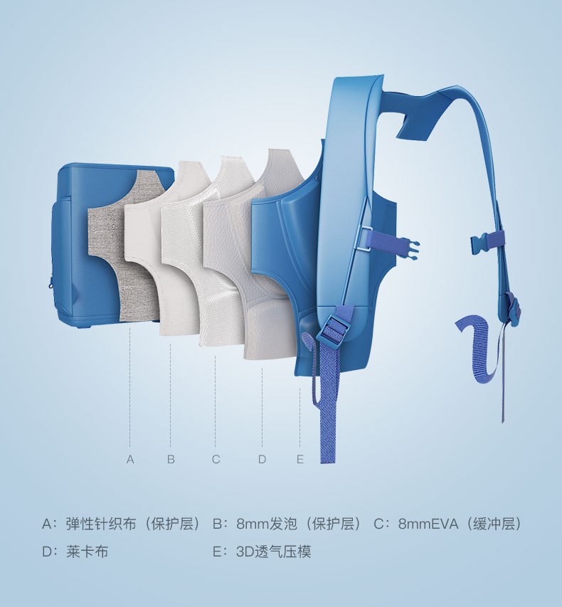 小扬书包不仅仅注重面料的环保健康,更强调其强大的背负系统。有调查显示,中国小学生书包重量可高达 4.8 公斤,沉重的负担是压弯孩子脊椎导致他们弯腰斜肩的罪魁祸首。致力于为小朋友们减负的小扬在红点奖主评委、小扬战略顾问 Tapani 教授的指导下,引入登山包的减负背负设计。