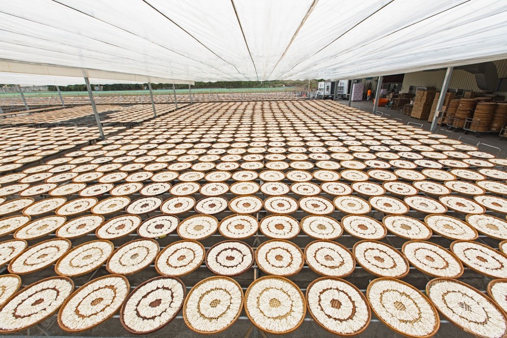 ”关庙面“遵循古法朴素制面传统,不任何化学添加,通过将水、盐和面粉的搭配手工制面,日晒足足两天,每隔几个小时还要人工翻一面,保证面体周身充满了太阳的味道。这样的面条Q弹筋斗,久煮汤汁不浑浊,面体也不糊烂。
